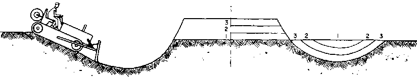 En el Sudán se ha ido gradualmente perfeccionando un aparato llamado Tolard No. 5 (Figura 45). En un bastidor de maderos se fijan cuchillas de niveladora inclinadas respecto del eje del instrumento. Sobre el bastidor se fija además un cajón de lastrado que se llena más o menos según el fin perseguido en cada tramo de la carretera. La inclinación de las cuchillas dirige los materiales sueltos hacia el eje de la calzada.