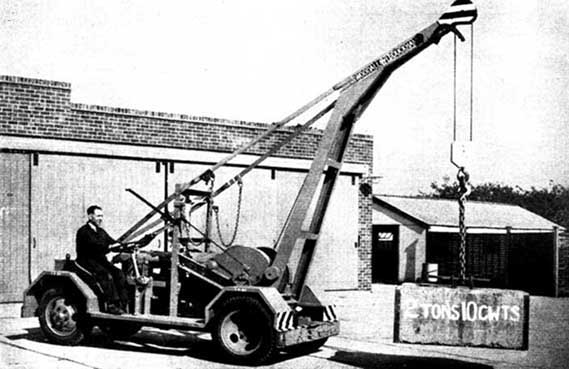 Grue hydraulique 3 tonnes Tunny. Grue 3 tonnes à commande hydraulique montée sur un châssis de camion Bedford à 4 roues motrices. Flèche de 16 ft (4,87 m); porte 3 tonnes sur un rayon de 7 ft (2,13 m), 2 tonnes sur 9 ft (2,74 m), 1 tonne sur 14 ft 9 in. (4,5 m). Rallonge de flèche de 10 ft (3 m). Existe aussi en version automotrice mise en uvre par tracteur Fordson Super Major.