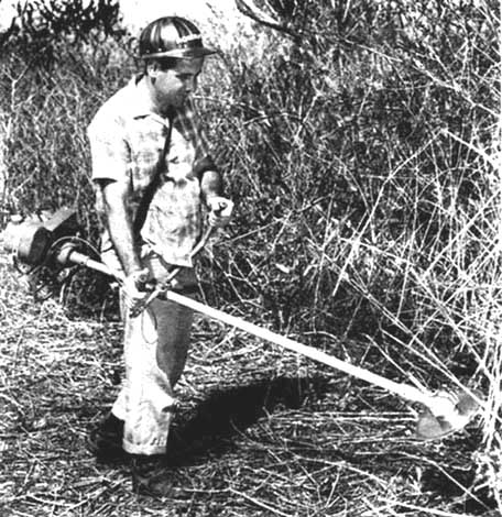 Débroussailleuse - Convient pour le nettoyage des champs, routes ou autres surfaces envahis par la végétation. Actionnée par un moteur à essence 2 temps Homelite. Mancherons réglables et embrayage à friction. Poids 28 lb (12,7 kg). L'arbre droit de 5 ft (1,62 m) permet d'atteindre les branches surplombantes et de tenir éloignée de l'opérateur la scie avec sa lame de 10 in. (25,4 cm).