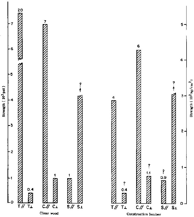 Comparisons of strength properties of wood (Douglas fir) in tension (T), compression (C) and shear (S) in directions parallel (//) and perpendicular (1) to grain illustrate nature's finest contribution as well as its major fault. Comparison of clear wood and construction lumber illustrates the further impact of man's manipulation. Note that suffers most, while other properties change very little, or possibly gain. The question marks indicate lack of knowledge of specific values for these properties.