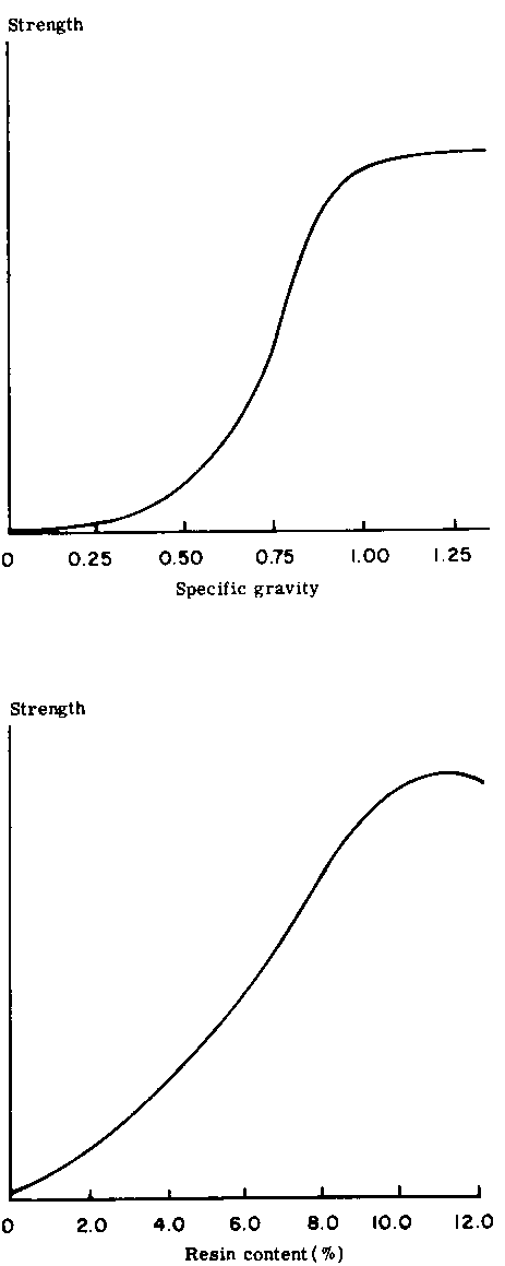 The relationship of specific gravity and resin content to strength illustrates two powerful processing variables which must always be specified in the synthesis of wood composition materials.