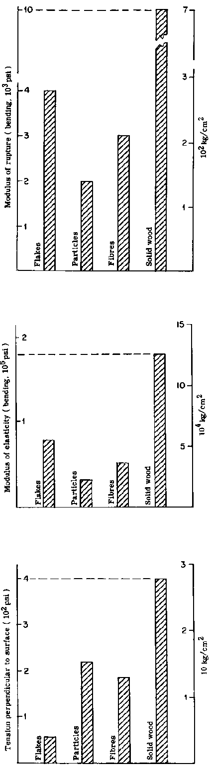 Important refinements in controlling the properties of wood materials come from the geometry of the wood element. Figure S shows typical strengths achieved by three elements, flakes, particles and fibres, compared to solid wood of Douglas fir, the strength of which may represent a goal of sorts. For example, flakes produce high modulus of rupture and modulus of elasticity, but low values in tension perpendicular to the surface. Particles, on the other hand, produce high values in tension perpendicular to the surface, but low values in the other two properties. These and other elements combined in layers, as illustrated in Figure 6, provide an effective means of bringing the best feature of each to bear in the same product.