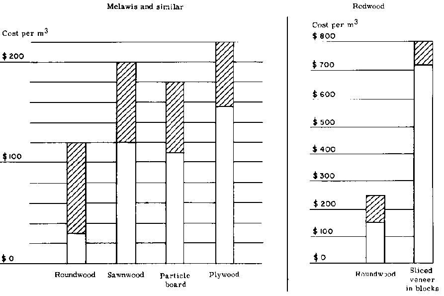 Hatched lines indicate the proportion of freight costs contained in products costs. First four columns refer to one species which could be exported in four product forms. The two columns on the right are for a species of Asian redwood used mainly for peeler veneer. All figures are approximate and refer to c.i.f. Singapore/Europe in December 197.(Source: the author).