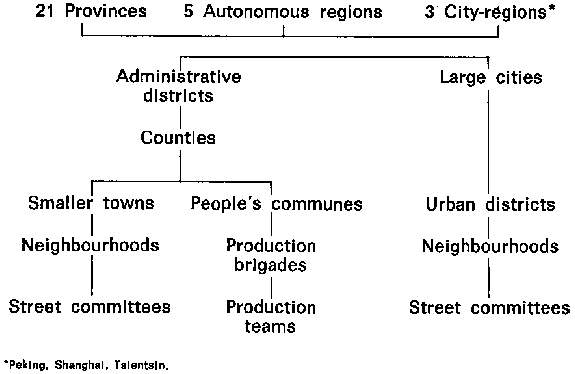 The provinces are divided into administrative districts and large cities. The administrative districts are divided into counties, which in turn comprise smaller towns and people's communes. Occasionally there is an intermediate level, the county being divided into districts, each of which groups a number of people's communes. Each people's commune consists of a number of production brigades, and each production brigade of a number of production teams - these last being the basic accounting unit in the people's communes. In the case of some of the larger communes, with many production brigades, these brigades may be grouped into management districts, which thus constitute an intermediate link in the system.