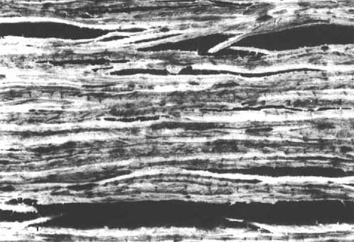 La figure montre comment l'une des propriétés prééminentes du bois, la résistance à la traction parallèle au fil du bois, varie depuis le niveau moléculaire jusqu'à la valeur très dépréciée avec laquelle les ingénieurs doivent travailler, au niveau, par exemple, des bois d'uvre. L'espèce choisie ici est le sapin Douglas, essence d'élite pour la construction aux Etats-Unis. Il est intéressant de remarquer que la chute se produit surtout au-dessus du niveau de la fibre, là où les besoins de longues pièces rectangulaires font que certaines caractéristiques naturelles, nuds et contre-fils deviennent des défauts. Et, qui plus est, la variabilité du matériau impose un lourd tribut au calcul statistique de la contrainte admissible.