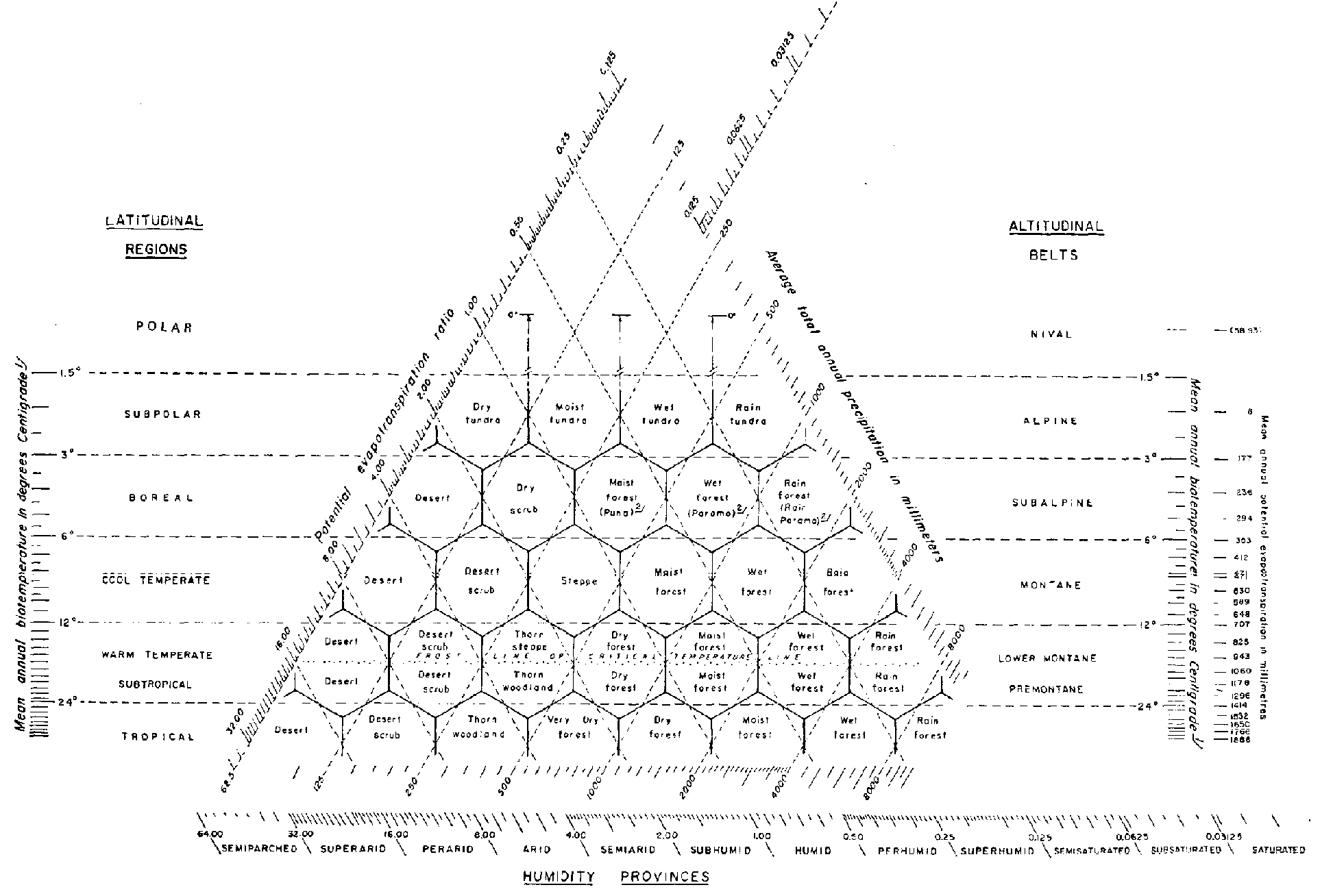 In essence, the Holdridge theory postulates a division of the earth's climate into ecologically equivalent units (approximately 120). Each unit, representing one sector of the climatic continuum, supports a distinctive set of possible plant communities, termed associations, and is designated a life zone. Any given life zone will include a variety of associations depending on soils, topographic features, drainage, winds, fog, and the like. The model which relates the critical climatic variables to the life zone is represented in the diagram. The climatic variables are: (a) mean annual biotemperature, (b) mean annual precipitation; and (c) the potential evapotranspiration ratio.