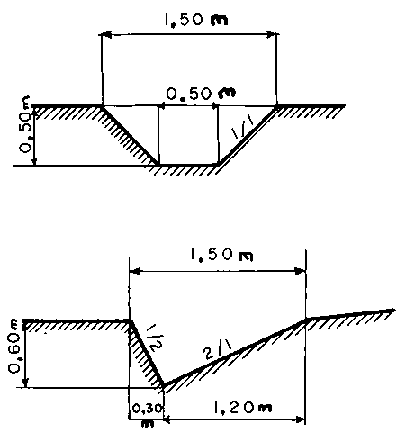 FIGURE 3. - Above, a ditch dug by hand; below, one made by a grader.