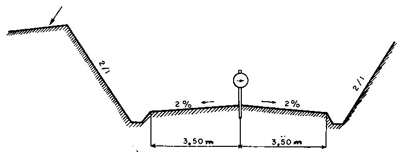 Roads on stabilized soil, on the other hand, are always made so that the shoulders continue the camber of the roadway - these are flush shoulders. Their transverse slope should be at least equal to that of the road to facilitate the complete run-off of water - say, 4 to 5 percent toward the ditch. They can be made use of by light vehicles when they are passing or being overtaken on a single track road. The width of the shoulders often varies and is only limited by the need for loaded trucks to pass each other. In practice, a minimum width of 1.5 to 2 meters is sufficient for all needs.