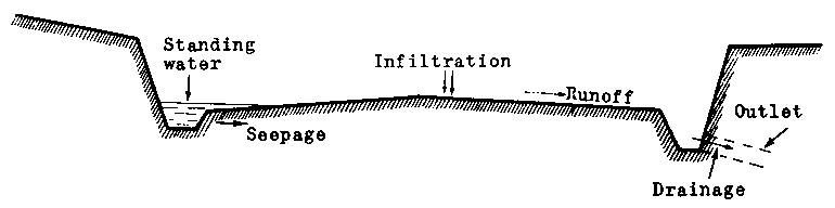 In practice, the costs of waterproofing or sealing material for the surface, for example, bitumen, tar and cement, are too expensive for their use to be economic on forest roads. Such waterproof surfacings are used only on roads with properly constructed bases. It will be seen in Section 2 that it is essential to avoid standing water, seepage and, of course, gullying. The choice of slope in the cross section must be a compromise; it must be steep enough to ensure the rapid runoff of water and gentle enough to prevent any gullying. It is desirable to ensure that the run-off of rain water should be in the form of a sheet of water of reasonably uniform depth, thus reducing infiltration and gullying to the minimum. Any puddles increase seepage and lead to localized run-off in rivulets and not in uniform sheets of water. These rivulets tend to converge and result in a network of small gullies.