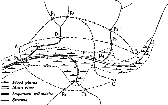 FIGURE 1. - Layout for a system of forest roads leading to a river suitable for floating and for barges. The number of knee indicates the importance of the road.