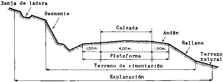 El concepto de explanación se aplica sólo en las zonas en que los derechos de propiedad o de ocupación del terreno se definen de forma precisa. El terreno de cimentación corresponde a la anchura de descepado en las zonas arboladas. La plataforma es suficientemente ancha para que los vehículos puedan cruzarse o adelantarse en las carreteras de pista única. La calzada de una carretera forestal es casi siempre de pista única, atendiendo al número relativamente reducido de vehículos que por ella circulan cada día.