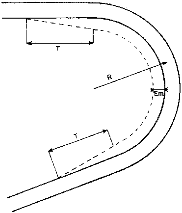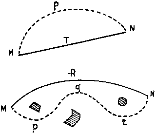 FIGURA 13. - La curva de radio grande M R N es preferible a las dos curvas en sentido contrario M p q r N.