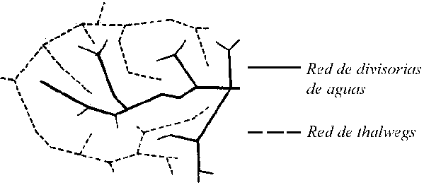 FIGURA 1. - Esquema de una red de carreteras forestales que desembocan en un río que permite la flotación o el transporte en barcazas. La anchura del trazo indica la importancia de la carretera.