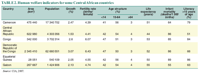 Central African nations rank among the lowest in the world on most human welfare indicators and among the highest in population growth and fertility (Table 2). All countries in Central Africa except Gabon (which has relatively high urbanization and per capita income) have high population growth rates and a predominantly young population. Low literacy rates and lack of education, particularly among women, are recognized factors in the high fertility rates and are critical issues facing both conservation and human development in Central Africa. High population growth rates ultimately also affect the environment.