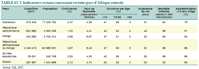 Les pays d’Afrique centrale se situent, à l’échelle mondiale, aux niveaux les plus bas de la plupart des indicateurs sociaux mondiaux et aux niveaux les plus élevés des indicateurs de croissance démographique et de fécondité (tableau 2). Tous les pays d’Afrique centrale, sauf le Gabon (qui se caractérise par une urbanisation et un revenu par habitant relativement élevés), ont des taux élevés de croissance démographique et une population constituée principalement de jeunes. Les faibles taux d’alphabétisation et le manque d’éducation, notamment chez les femmes, expliquent les taux élevés de fécondité et représentent des questions cruciales pour la conservation et le développement humain en Afrique centrale. Les taux élevés de croissance démographique ont aussi une incidence sur l’environnement.