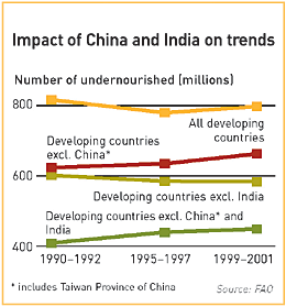 These numbers and trends are dominated by progress and setbacks in a few large countries. China alone has reduced the number of hungry people by 58 million since the World Food Summit baseline period. But progress in China has slowed as the prevalence of undernourishment has been reduced. At the same time, India has shifted into reverse. After seeing a decline of 20 million in the number of undernourished between 1990–1992 and 1995–1997, the number of hungry people in India increased by 19 million over the following four years.