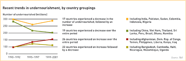 In 17 other countries, however, the trend shifted in the opposite direction and the number of undernourished people, which had been falling, began to rise. This group includes a number of countries with large populations, among them India, Indonesia, Nigeria, Pakistan and Sudan.