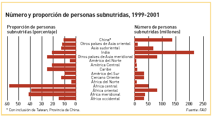 La FAO estima que en 1999-2001 había en todo el mundo 842 millones de personas subnutridas. Esta cifra comprende 10 millones en los países industrializados, 34 millones en países en transición y 798 millones en países en desarrollo. En el nivel regional, el número de personas subnutridas se redujo en Asia y el Pacífico y en América Latina y el Caribe. En cambio, las cifras siguieron aumentando en el África subsahariana y el Cercano Oriente y África del Norte.
