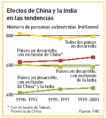 Esas cifras y tendencias están dominadas por los avances y retrocesos en algunos grandes países. Sólo en China se ha reducido el número de personas hambrientas en 58 millones desde el período de referencia. Sin embargo, el progreso en China se ha desacelerado a medida que se ha reducido la prevalencia de la subnutrición. Al mismo tiempo, la India ha retrocedido. Después de una disminución del número de personas subnutridas de 20 millones entre 1990-1992 y 1995-1997, el número de personas hambrientas en la India aumentó en 19 millones en los cuatro años siguientes.