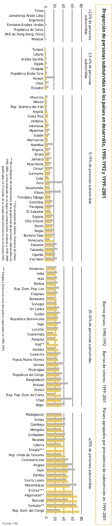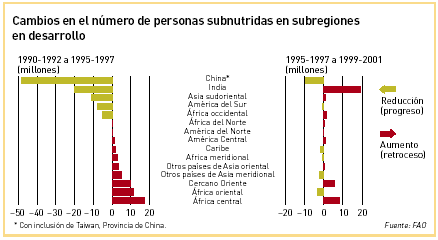 LAS ESTIMACIONES MÁS RECIENTES de la FAO indican un revés en la guerra contra el hambre. El número de personas crónicamente hambrientas en los países en desarrollo disminuyó en sólo 19 millones entre el período de referencia de la Cumbre Mundial sobre la Alimentación (1990-1992) y 1999-2001. Ello significa que el objetivo de la Cumbre de reducir el número de personas subnutridas a la mitad para el año 2015 sólo podrá alcanzarse si a partir de ahora la reducción de ese número se acelerara a 26 millones por año, es decir, más de 12 veces el ritmo de 2,1 millones logrado hasta la fecha.