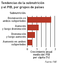 | Análisis de las claves del avance y los reveses en la reducción del hambre Al tratar de analizar los factores que determinan los avances en la reducción del hambre, una combinación de seis indicadores resultó ser la mejor para diferenciar entre los países, agrupados según los resultados obtenidos entre 1990-1992 y 1999-2001. Esos indicadores comprenden el crecimiento de la población, el crecimiento del PIB per cápita, el gasto en salud en porcentaje del PIB, el porcentaje de adultos infectados por el VIH, el número de emergencias alimentarias y el índice de desarrollo humano del PNUD (compuesto a su vez por muchos indicadores económicos y sociales). En los países que lograron reducir el hambre durante todo el período de nueve años, el PIB per cápita creció a una tasa anual del 2,6 por ciento, es decir, más de cinco veces superior a la tasa de los países en que la subnutrición aumentó en ambos subperíodos (0,5 por ciento). Los países con más éxito tuvieron también un crecimiento agrícola más rápido (3,3 por ciento anual en comparación con sólo el 1,4 por ciento en los países en que el hambre aumentó durante el decenio), tasas más bajas de infección por VIH, un crecimiento de población más lento y muchas menos emergencias alimentarias.