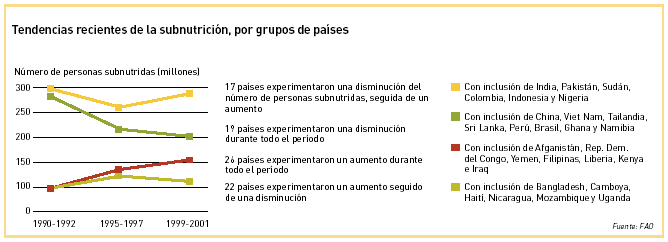 Al invertirse la tendencia en muchos países grandes y desacelerarse el avance en otros, la pauta del cambio en los países en desarrollo en su conjunto pasó de una tendencia descendente a otra ascendente. Entre 1995-1997 y 1999-2001, el número de personas hambrientas en los países en desarrollo aumentó en 18 millones, neutralizando casi la mitad del aumento de 37 millones logrado en los cinco años anteriores. A no ser que se logren progresos importantes en los países grandes en que se han detenido, será difícil invertir esa tendencia negativa.