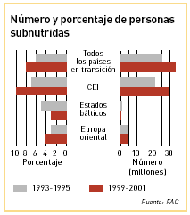 El primer análisis hecho por la FAO de los cambios ocurridos desde la desintegración de la Unión Soviética y Yugoslavia muestra que el hambre está aumentando en muchos países en transición. En general, el número de personas subnutridas en estos países creció de 25 a 34 millones entre 1993-1995 y 1999-2001. Las estimaciones deben considerarse provisionales, ya que la realización de encuestas por muestreo de hogares, para sustituir los datos obtenidos de los registros administrativos, se encuentra todavía en una etapa temprana.