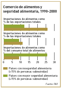 De un análisis más detallado se deduce que el acceso precario a los mercados internacionales y una integración deficiente en los mismos limitan la capacidad de los países donde el hambre está extendida para importar alimentos suficientes para compensar la escasez de la producción interna. Los países donde más del 15 por ciento de la población pasa hambre gastan más del doble de sus ingresos de exportación en importar alimentos que países con mayor seguridad alimentaria (véase el gráfico). Además, su pobreza y actividades comerciales limitadas restringen tanto sus ingresos de exportación como su capacidad para comprar más alimentos en los mercados internacionales.