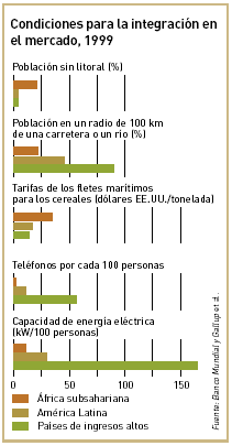Si no existen los mercados fundamentales o no funcionan correctamente, los cambios de los precios relativos no traerán consigo un uso más eficiente de la producción, el empleo y la inversión, como supone la teoría de la ventaja comparativa. De igual modo, la falta de carreteras, puertos, telecomunicaciones y una infraestructura de comercialización adecuados pueden impedir que un país logre participar en el comercio internacional y beneficiarse del mismo (véase el gráfico).