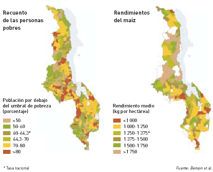 | Los mapas de la pobreza de Malawi ayudan a orientar los proyectos de obras públicas Con ayuda del Instituto Internacional de Investigaciones sobre Políticas Alimentarias (IIPA), Malawi ha preparado un Atlas de estadísticas sociales. Los mapas de la pobreza incluidos en el atlas han sido utilizados por el Programa mundial de alimentos y el Fondo de acción social de Malawi para orientar proyectos de obras públicas que proporcionen empleo y mejoren la infraestructura en las comunidades empobrecidas. Se espera que los mapas del atlas se utilicen para ayudar en la distribución de fertilizantes y simientes gratuitos en el marco del programa de equipo básico. Combinar los mapas de la pobreza con mapas de otros indicadores socioeconómicos y ambientales puede revelar factores que contribuyen al hambre y sugerir vías de actuación. Muchas zonas del Malawi meridional y central muestran a la vez altas tasas de pobreza y bajos rendimientos de maíz.