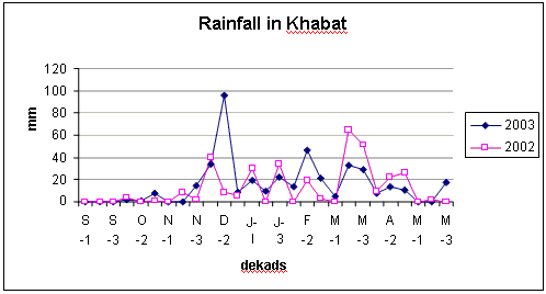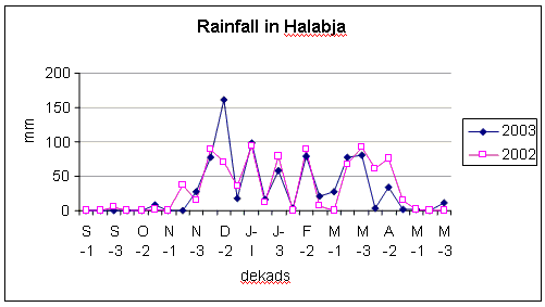 In Figure 2 data from three strategically located sites in the northwest (Zahco), centre (Khabat), and southeast (Halabja) that were visited by the Mission; show that the rainfall less well distributed to have been less abundant than last year, with a premature finish to the season in early April.