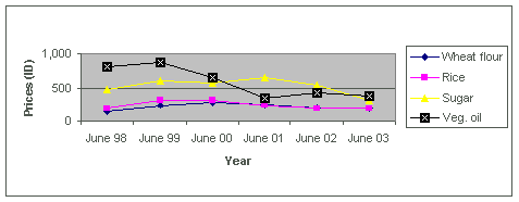 The past decade has also seen a general decline in agricultural producer prices. Between June 1995 and June 1996 alone, the price of wheat dropped from US$172 to US$77 per tonne and that of barley from US$128 to US$66 per tonne. Such a decline may have served as a disincentive for local farmers but stimulated a burgeoning informal export market to Iran and Syria. Recently some measures and agreements have been undertaken by the Iraqi authorities (Ministry of Trade) and WFP which contributed to stabilising prices and controlling declining cereal farm-gate prices. As parties to a first Agreement the CPA, the MOT, and WFP agreed that MOT should act as the “procurer of last resort” for the wheat harvest of 2003 at a price of US$105 per tonne for home produced wheat grains received at MOT sites, up to a maximum of 1.25 million tonnes. A second agreement between the CPA, MOT and FAO stipulates that MOT should also act as the “procurer of last resort” for up to 500 000 tonnes of the 2003 barley harvest at a rate of US$65 per tonne received at MOT sites. However, in spite of specific arrangements made to accept smutty grains, the stringent quality controls and associated penalty clauses and sale acceptance may still penalize small farmers, with have no access to herbicides or grain cleaners.