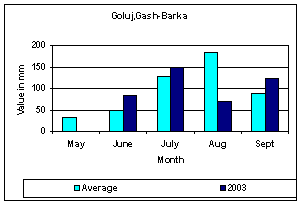 Some areas received exceptionally high rainfall during 2003. In Dekemhare, Debub zoba, rainfall from March to August amounted to 785 mm over 39 rain-days, with 282.5 and 340 mm, respectively, in July and August. However, this pattern was not repeated in the more important cropping areas such Goluj in Gash Barka, where July and August rainfall was only 78.8 mm and 69.3 mm against an average for the previous four years of 115 mm and 154.7 mm, respectively. The occasional occurrence of exceptionally heavy rainfall underlines the importance of water harvesting and of controlling the run-off from the highlands to the spate-irrigated areas in Northern Red Sea zoba.