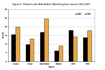 Nutrition surveys undertaken during the March–June hunger period indicate that the nutrition status of children under five years of age has deteriorated since mid-2002 in all regions except Northern Red Sea. As indicated in the table below, the sharpest increases in malnutrition were found in Gash Barka, which also had the highest global acute malnutrition rate (wasting) at 24 percent, an increase from 17 percent in 2002. Rates in Anseba also rose to 20 percent from 16 percent in 2002. Additionally, surveys in four of the six regions found high rates of maternal undernourishment, ranging from 30–53 percent of women, with the highest rates in Gash Barka and Anseba. Maternal nutrition is frequently used as a proxy for household food security. Higher rates of malnutrition in these areas, including higher potential areas (Gash Barka is the breadbasket of Eritrea) reflect the lack of livelihood diversity. Households depend almost solely on crop production, while most livestock here are not drought-resistant. As a result, losses of crops and livestock had major impacts on food access.