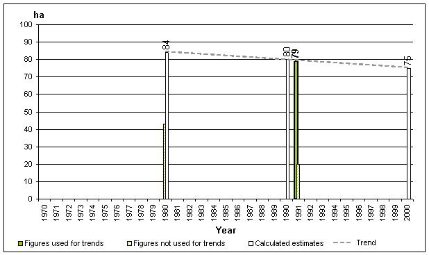 The estimates for 1980, 1990 and 2000 have been calculated applying FRA 2000 (FA0, 2001) annual forest cover change rate for 1990-2000 (-0.6 percent) to the most recent, reliable figure.