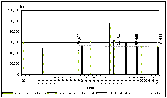Estimation and updating based on: Forest Department. 1968. Forest Department Annual Report 1966 Nairobi; Forestry Department. 1974. Progress Report 1966-72. Prepared for the Tenth Commonwealth Forestry Conference 1974, Nairobi; Royal College of Forestry. 1975. Land use in Kenya and Tanzania. Lundgren, B., ed. Stockholm | |