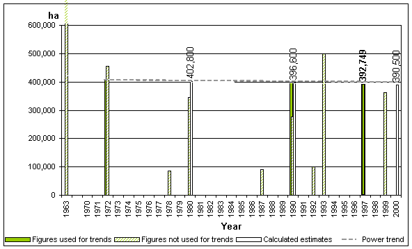 Cited in: FAO. 1994. Study for the determination of the rate of deforestation of the mangrove vegetation in Mozambique. By Saket, M., Matusse, R. V. Field document MOZ/92/013. FAO, Rome, Italy. 9 pp Approximate estimate. | |