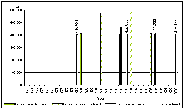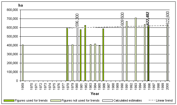 Cited in: FAO, UNEP. 1981. Tropical Forest Resourcess Assesment Project, Forest Resources of Tropical Asia. FAO, UNEP, 475 pp. This figure refers to the extent of mangroves in the Sundarbans. | |