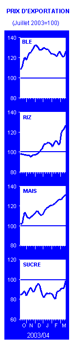 La facture mondiale d’importation de céréales de 2003/04 devrait augmenter de 2 pour cent par rapport à l’année précédente pour s’établir à environ 38 milliards de dollars E.-U. Bien que l’on prévoit une contraction du volume des échanges, celle-ci sera compensée par un relèvement des cours internationaux et une forte augmentation des taux de fret maritime. |