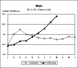 Les prix à l’exportation de la plupart des céréales secondaires ne cessent d’augmenter depuis le début de la campagne de commercialisation en juin. Les cours internationaux du maïs sont même passés en dessus des niveaux de la campagne précédente depuis la mi-octobre 2003, du fait du resserrement des disponibilités et de la forte demande. Tandis que les épizooties constatées en Amérique du Nord et en Asie (ESB et grippe aviaire) ont quelque peu freiné la demande de céréales fourragères, les cours se sont maintenus du fait des ventes réduites de la Chine, d’une baisse pratiquement sans précédent des stocks des États-Unis et des redressements persistants des cours du soja. En mars, les prix à l’exportation du maïs américain (No. 2, jaune) étaient en moyenne de 128 dollars E.-U., ce qui représente un gain de près de 24 dollars E.-U. depuis octobre et une hausse de 23 dollars E.-U. la tonne, soit 22 pour cent, par rapport au même mois l’année dernière. De même, fin mars, le contrat juillet 2004 négocié au CBOT a augmenté de 36 dollars E.-U. par rapport à la même période l’an dernier. Il est probable que les cours du maïs resteront élevés pendant un certain temps, mais ils pourraient retomber par rapport aux hauts niveaux actuels du fait de récoltes plus importantes que prévues en Argentine et de pronostics plus optimistes concernant les récoltes en Afrique du Sud.