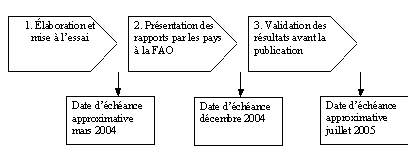 Les rapports nationaux devront être soumis à la FAO (de préférence par courrier électronique ou sur disquette CD-ROM) avant la fin de 2004. L’équipe de FRA examinera les rapports et demandera au besoin des éclaircissements et des amendements. Une fois terminé l’examen, il sera demandé aux pays de valider officiellement leur rapport avant sa publication. Cela signifie que la FAO n’impose pas aux correspondants nationaux d’obtenir une approbation officielle avant la soumission de leur rapport préliminaire. Les rapports nationaux devront être rédigés en anglais, français ou espagnol.