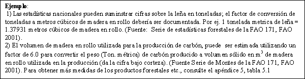 • Las estimaciones también pueden realizarse convirtiendo el volumen de los productos nacionales al volumen de madera en rollo necesario para producir ese volumen (el equivalente de la madera en rollo). (Fuente: FAO Serie de estadísticas forestales 171, FAO, 2001).