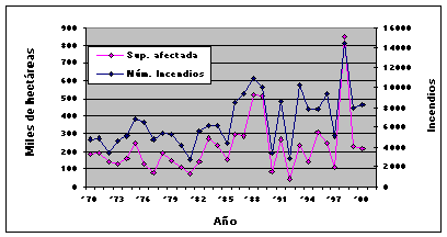 Figura 2.2.Número de incendios forestales y hectáreas afectadas.