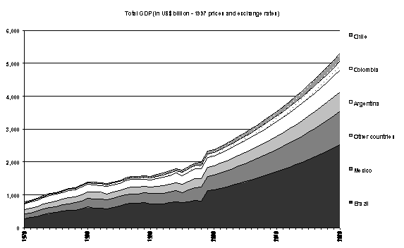 The total size of the Latin American economy was US$ 1 970 billion at 1997 prices and exchange rates (World Bank, 1999b). This amounts to about 7% of total world income or, about the same as the GDP of Germany. Since Latin America has just over 7% of the world population, it has a level of income per person that is roughly equal to the global average5.