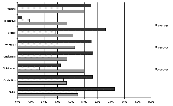 Figure 9 Historical and projected average annual growth in real GDP from 1970 to 2020-Central America