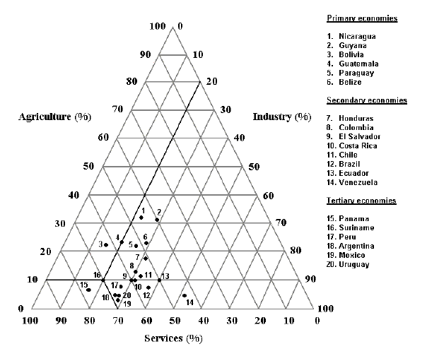 Figure 13 shows how the different economies in Latin America compare in terms of their structure. The proportion of the economy accounted for by agriculture, industry and the service sector is shown on the left-hand, right-hand and bottom axes respectively. For example, the structure of the economy in Suriname (10% agriculture, 20% industry and 70% services) is shown at the intersection of the three black lines in the figure.
