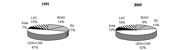 North South agreements (Table 12 ) have a direct relation with the increase of trade. For example, between 1991 and 2000 trade increased from US$ 22.7 billion to US$ 36.3 billion between EU and MERCOSUR. Similarly, EU exports to MERCOSUR increased from US$ 7.9 billion to US$ 19 billion and MERCOSUR exports to EU from US$ 14.8 billion to USD $ 17.3 billion. The NAFTA has also had a major impact for the second main economy of Latin America, Mexico. However, North-South agreements could not produce important advances in the regional negotiations if they are not significant changes in the multilateral side e.g. respect to subsidies and agriculture protectionism or antidumping measures. (CEPAL/ECLAC. Baumann, 2002).