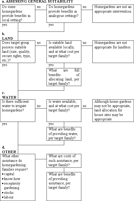 In determining whether to adopt homegardening as a strategy for improving the livelihood of poor families, planners must begin by defining the class of prospective beneficiaries.[17] Although homegardening may be a beneficial intervention for both urban and rural poor populations, the opportunities are likely to differ based on a number of considerations. Suitable land is much more likely to be available in sufficient quantity and quality in rural areas, either because poor families already possess suitable land or because planners can obtain suitable land and distribute it to target families. Once the general class of beneficiaries is defined, we propose that planners undertake the following analysis, summarized in Figure 3.
