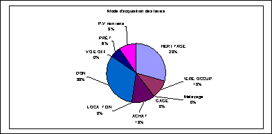 La deuxième période correspond à la « postcolonie ». Immédiatement après l’indépendance, l’Etat a été considéré comme le seul propriétaire des terres ; il tolérait cependant l’exercice du droit coutumier sur ces dernières. Plus tard, la diversification et le développement des cultures de rente, couplée à une forte immigration, ont accru la demande sociale en terres. Celle-ci a continué cependant d’être satisfaite en référence à la fois aux dispositions du droit ivoirien et à celles des coutumes s’avérant inadaptées au contexte. Afin de résoudre ce problème, un décret a été promulgué, mais son application est difficile puisqu’il est, depuis quelques années, l’objet de vives controverses. La figure 1 donne une idée des modes d’acquisition des terres en Côte d’Ivoire et on peut constater que 33% des terres sont acquises par donation.