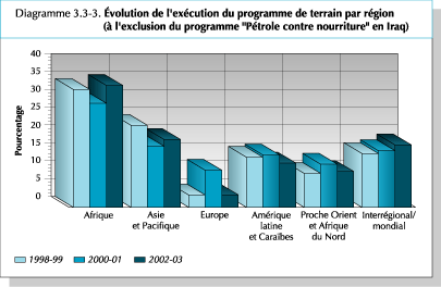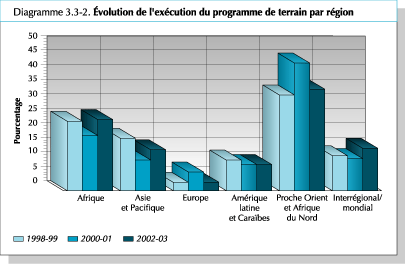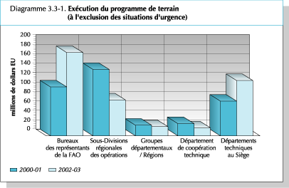 574. Les représentants de la FAO ont continué à assumer la responsabilité de la gestion budgétaire et opérationnelle des projets nationaux de la FAO autres que les projets de secours d’urgence (voir Grand Programme 3.3). Le nombre de ces projets a presque doublé, passant de 378 en 2001 à 564 en 2003, tandis que l’exécution a augmenté de 73 pour cent pendant la même période. Afin de consolider la capacité opérationnelle des bureaux des représentants de la FAO et de faciliter l’échange de données sur les leçons apprises et les meilleures pratiques utilisées dans le réseau des bureaux de représentants de la FAO depuis le transfert des responsabilités opérationnelles aux représentants, six ateliers régionaux ont été organisés, auxquels ont participé quelque 80 représentants de la FAO et leurs adjoints. Enfin, la quatrième session générale d’orientation à l’intention de 17 représentants adjoints de la FAO récemment nommés, couplée avec une semaine de formation à la supervision du cycle des projets, s’est tenue en 2003.